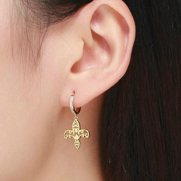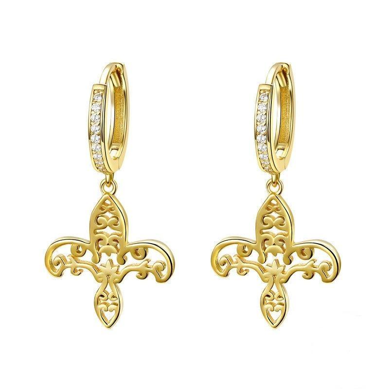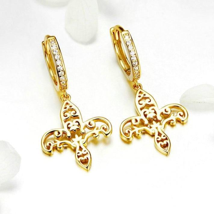 Realça os teus lóbulos perfurados com estes majestosos brincos dourados com motivo fleur-de-lis. Joias perfeitas que simbolizam pureza e amor casto.