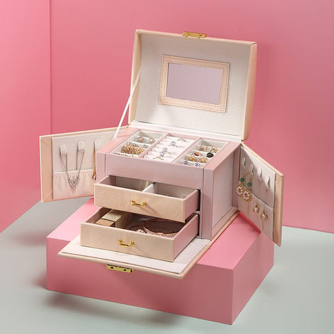 Esta caixa de joias de grande capacidade promete duas coisas: permite organizar a sua coleção de joias da melhor forma possível e ao mesmo tempo é um acessório elegante e sofisticado. A organização ideal da sua coleção de joias está garantida graças aos seus inúmeros compartimentos de arrumação. Painéis amovíveis para brincos, espaços dedicados para anéis, duas gavetas grandes para todo o tipo de objetos, abas laterais com bolsos e ganchos para colares – a lista é interminável, pois esta caixa de joias oferece todo o espaço de armazenamento de que necessita.
