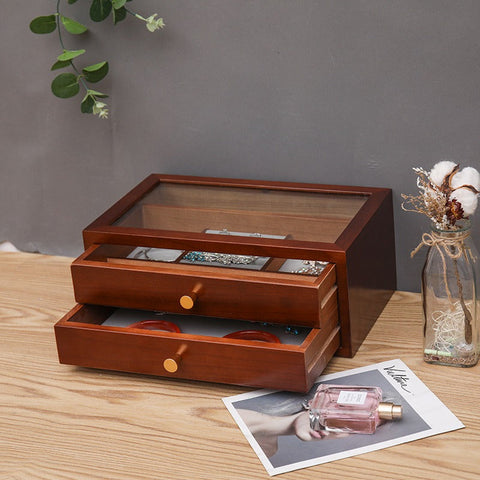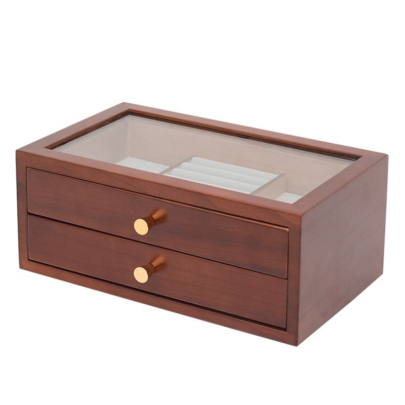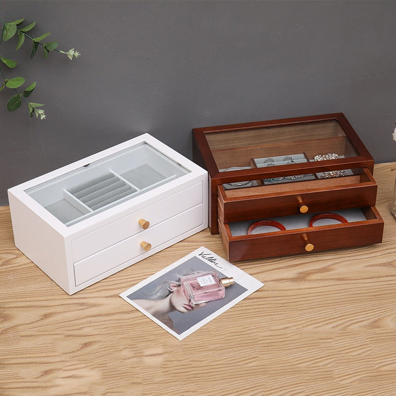 Esta caixa de joias em madeira, elegante e serena, é uma verdadeira vitrine onde pode exibir as suas peças favoritas! É feita de madeira maciça e possui 2 gavetas amovíveis.