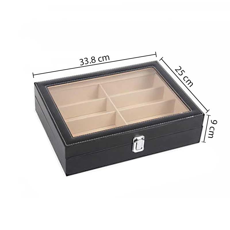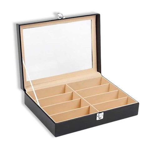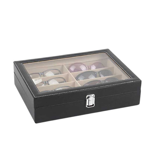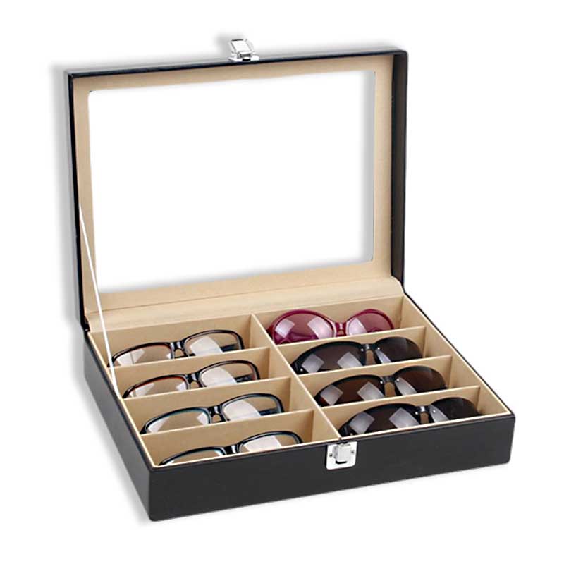 Esta grande caixa de óculos em couro ajuda-o a organizar e guardar os seus pares de óculos. O revestimento de veludo protege as lentes contra riscos e a tampa transparente mantém o pó afastado. É um organizador de óculos que pode ser facilmente guardado numa gaveta ou colocado sobre um móvel com elegância.