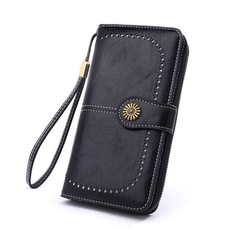 Carteira grande feita de couro sintético, com bolso para moedas, compartimento para cartões, bolso para notas e espaço para o cartão de identificação. O estilo vintage desta carteira adiciona um toque de elegância ao seu dia a dia, e a alça de pulso torna-a prática como uma bolsa de mão.