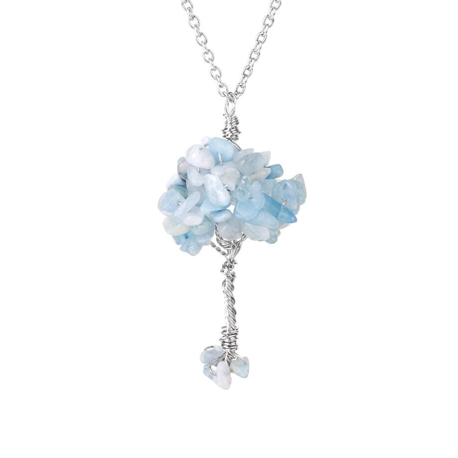 Está à procura de um colar único e bonito? Veja este deslumbrante colar de madeira com água-marinha! Este colar é feito com pedras naturais de água-marinha e uma liga de zinco que forma uma bela Árvore da Vida, tornando-o uma peça única que certamente atrairá todos os olhares.