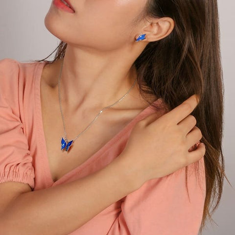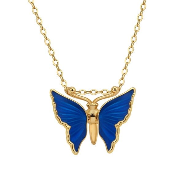 Materializa a tua feminilidade com este encantador colar com borboleta e asas azul-escuras.