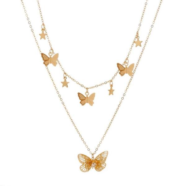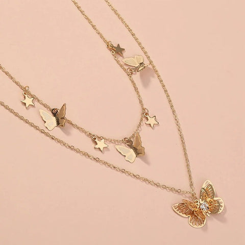 Este encantador colar apresenta duas correntes que emolduram elegantemente o seu peito. Os pendentes têm borboletas e estrelas.