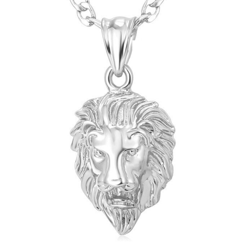 Impressionante colar com cabeça de leão na crina. Corrente de aço cor prateada e cabeça de leão com um estilo único. Símbolo de coragem e domínio — use este colar como um troféu e enfrente os desafios da vida com a agilidade do famoso predador carnívoro.