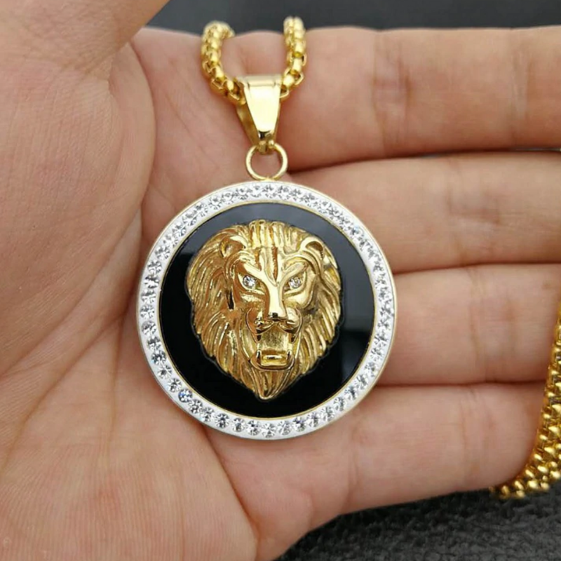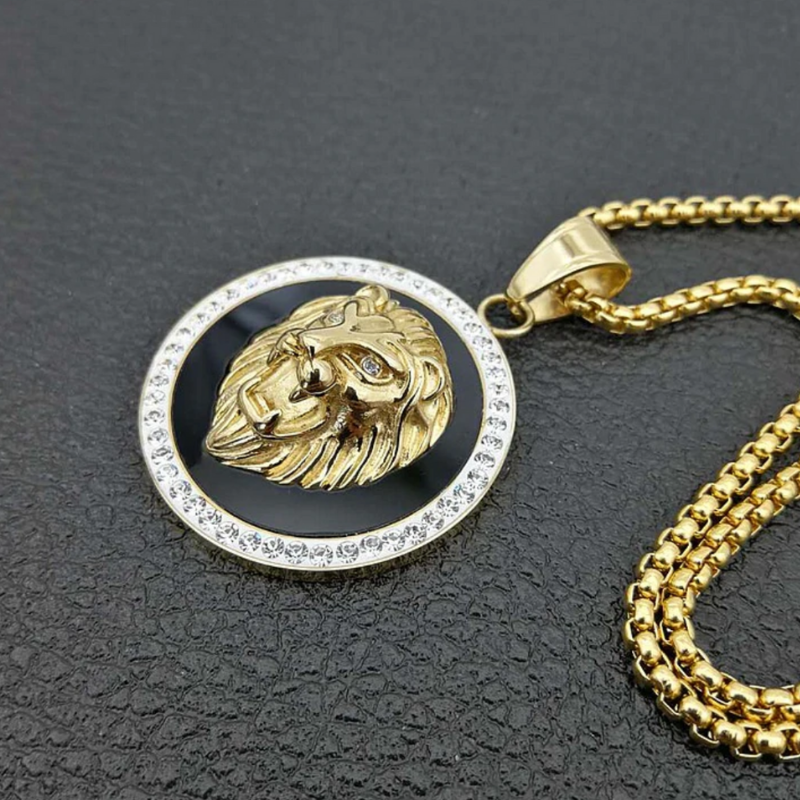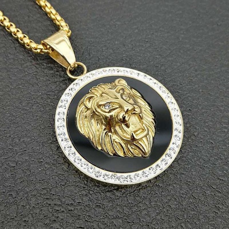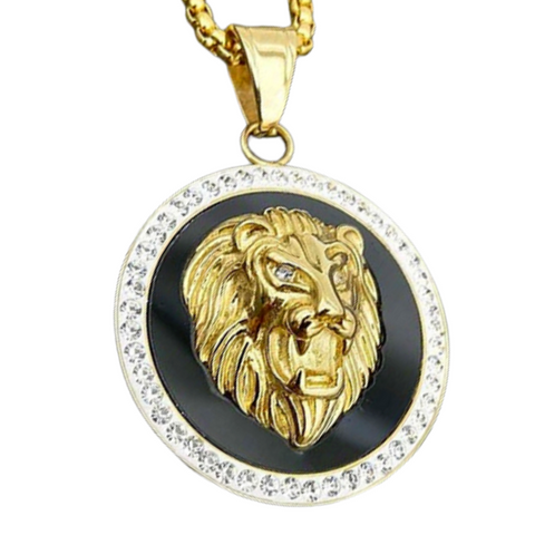 Deslumbrante colar com pendente de cabeça de leão dourada. Deixa que a força do leão te acompanhe ao usares este colar adornado com um aro de diamantes e a juba dourada do animal. A corrente também é feita de aço com acabamento dourado.