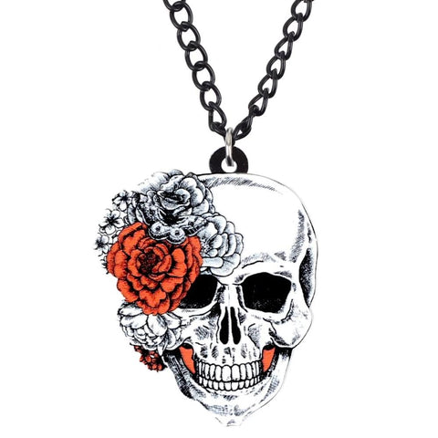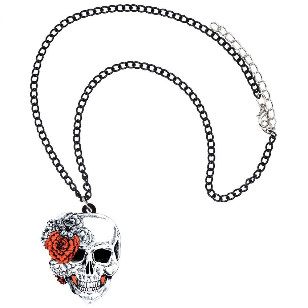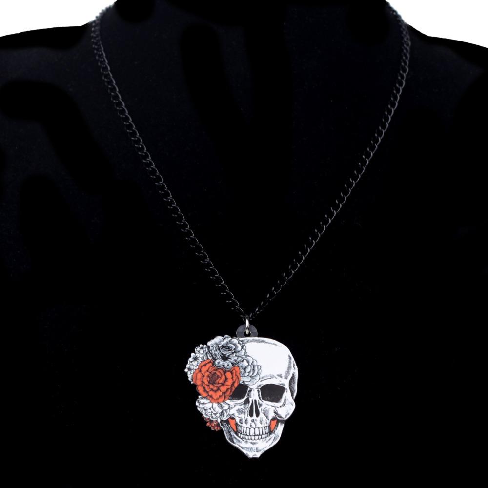 Procura um colar único? Então o nosso colar com caveira e ossos cruzados com flores é para si!