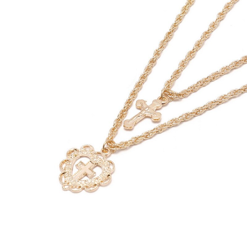 Este colar com pingentes de cruz e coração destaca qualquer conjunto.
