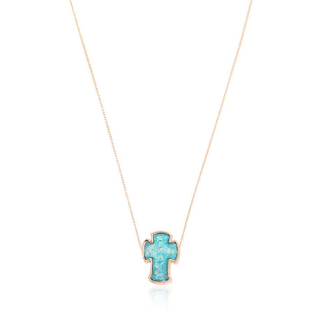 Colar com cruz que evoca o azul turquesa das lagoas.