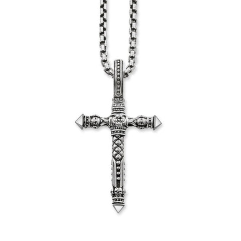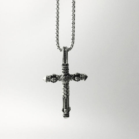 Este belo colar com cruz em prata é uma ousada combinação da tradição cristã com a masculinidade moderna, graças aos detalhes de caveiras e espinhos. Esta joia é perfeita para homens.