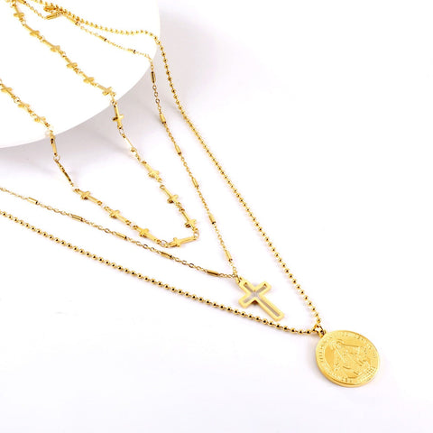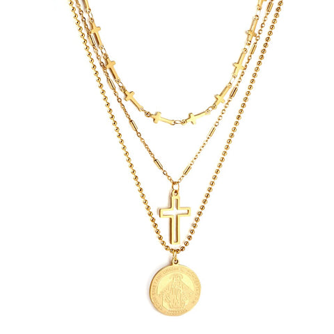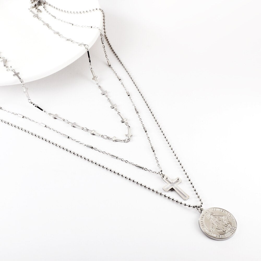 Estes três colares são feitos de aço inoxidável de alta qualidade. Este colar de várias camadas inclui três colares distintos. O primeiro, o mais curto, é composto por várias pequenas cruzes ligadas entre si. O segundo é um colar simples com um pendente em forma de cruz. O último é um colar com uma medalha representando Cristo.