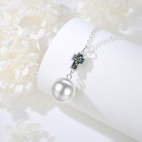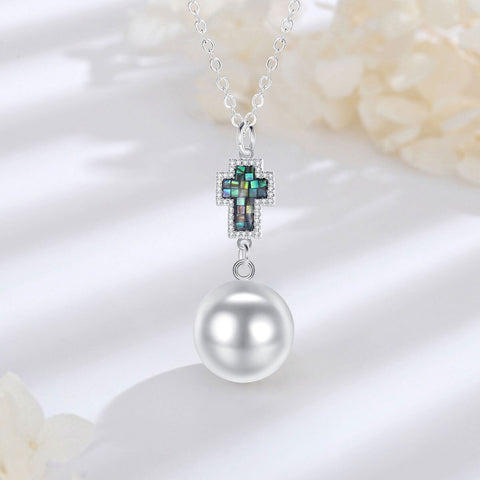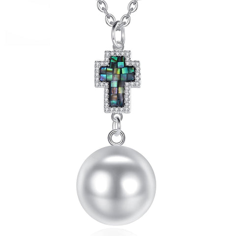Mima-te com este deslumbrante colar em forma de cruz, feito com madrepérola de abalone! O colar é ainda decorado com uma grande pérola nacarada. O que achas?