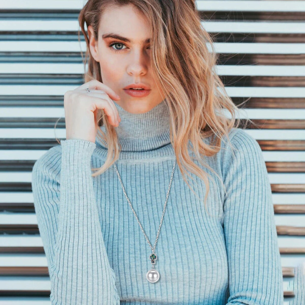 Esta bela joia é feita inteiramente de prata S925 e é perfeita para complementar o teu look. É adornada com madrepérola de abalone, incrustada em padrão mosaico na cruz. A pérola suspensa na cruz é um verdadeiro atrativo visual! A corrente do colar é extremamente longa, com mais de um metro de comprimento, o que lhe confere um toque muito original!