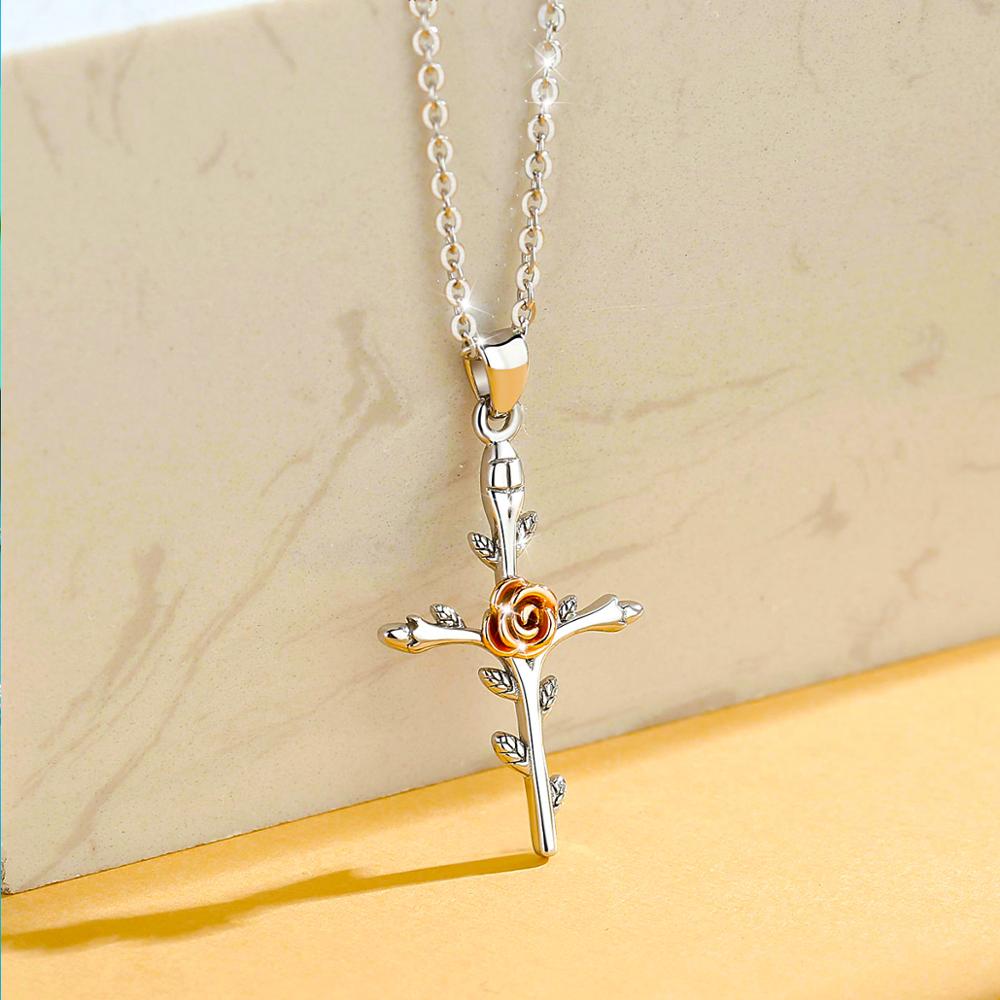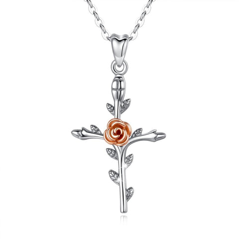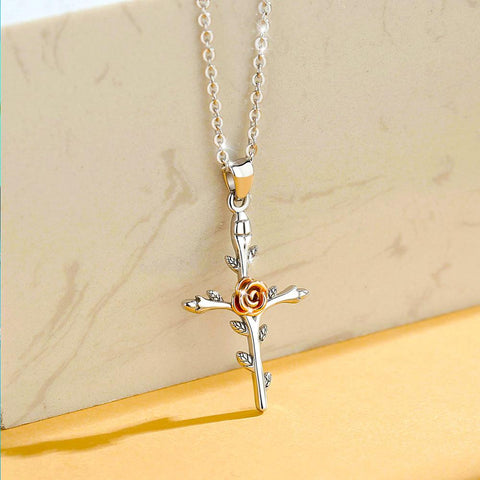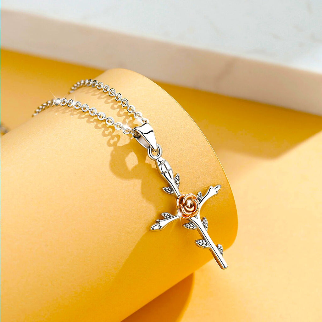 Este colar em forma de cruz é feito de prata S925, um metal nobre para louvar a Deus. A cruz é moldada na forma de uma rosa. A flor é revestida com metal banhado a ouro rosa. Esta bela combinação de cores torna-o ainda mais elegante.