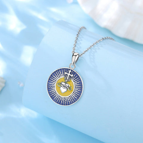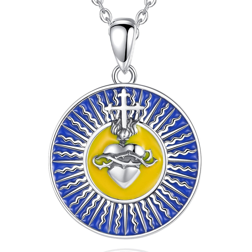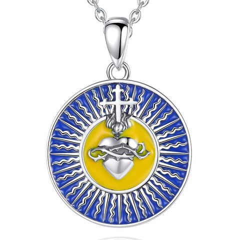 Não espere mais e mime-se com este belo colar feito inteiramente de prata S925 de alta qualidade. Graças às belas cores azul e amarela, que combinam perfeitamente com a prata, todos à sua volta vão invejá-lo. Tal como o Sagrado Coração, ele é deslumbrante!