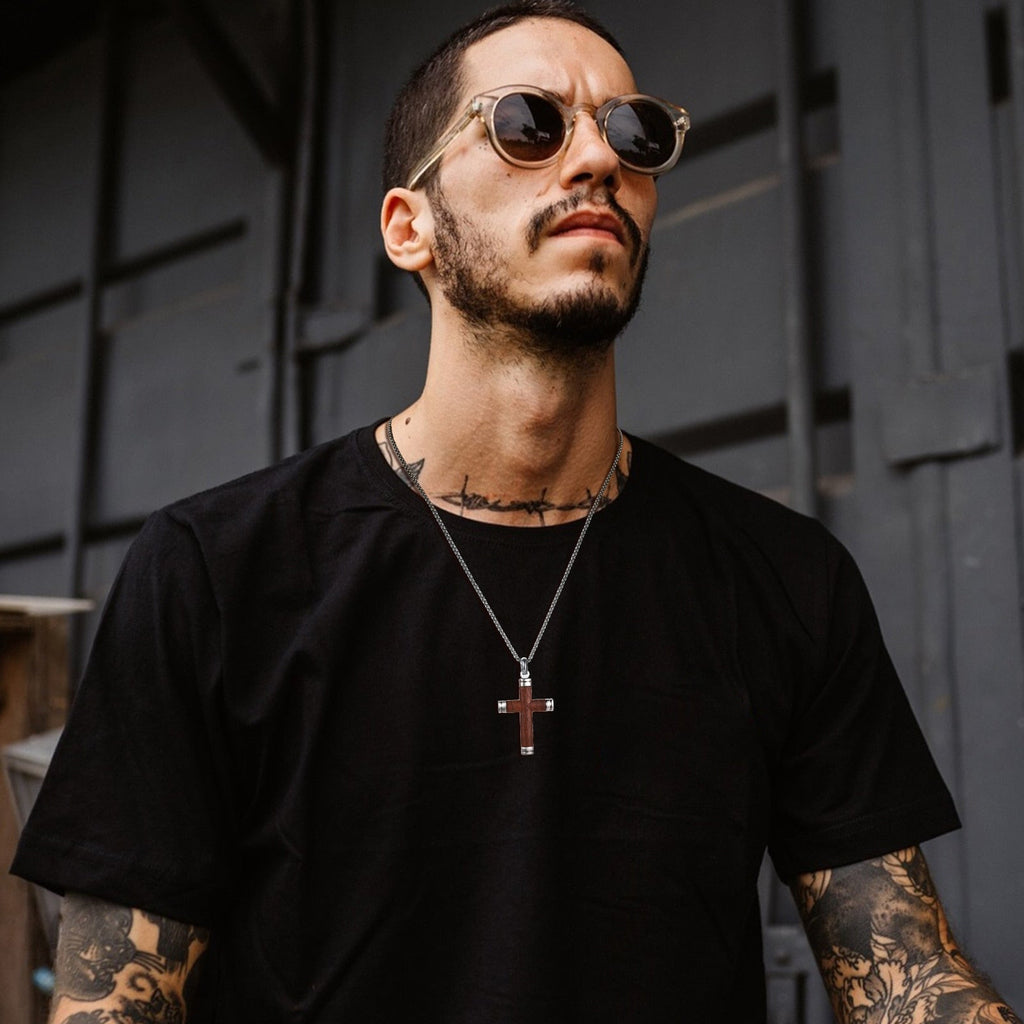 Este colar cristão, feito de aço inoxidável e madeira de pau-rosa, é adequado tanto para homens como para mulheres. O pendente foi cuidadosamente desenhado para garantir durabilidade. À volta do pescoço, complementa perfeitamente qualquer visual.