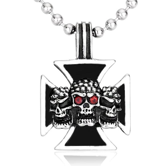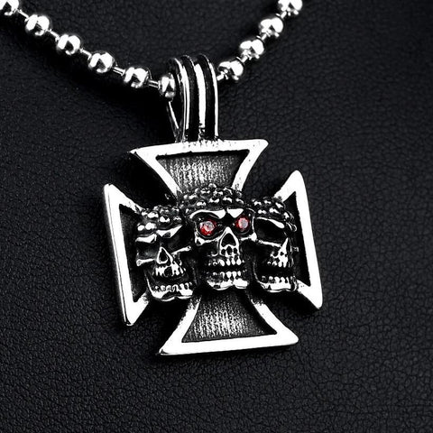 Impressionante pingente com cruz de Malta em aço inoxidável, com uma combinação de caveiras e cruzes de Malta. Este pingente de alta qualidade oferece um visual original e rebelde.