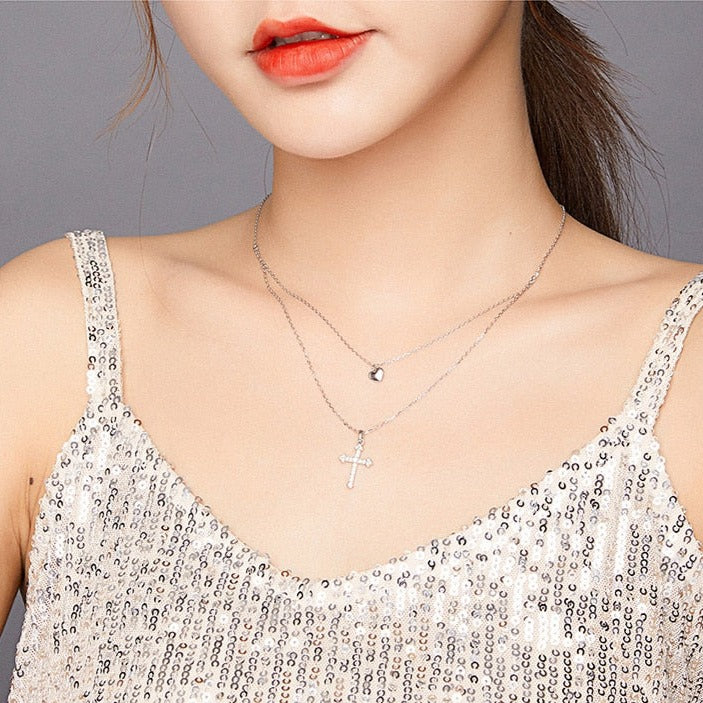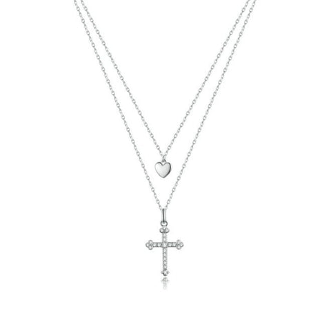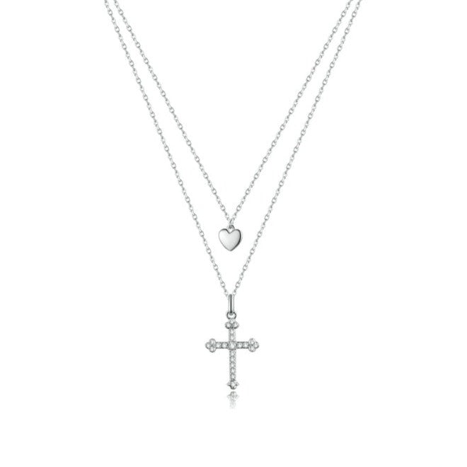 Feito em prata S925, este pendente confere ao seu visual um toque sofisticado e discreto. Apresenta duas voltas: a primeira termina com um pendente em forma de coração e a segunda com uma cruz de Jesus em trevo. Este colar demonstra o seu amor pelo Senhor e a sua devoção.