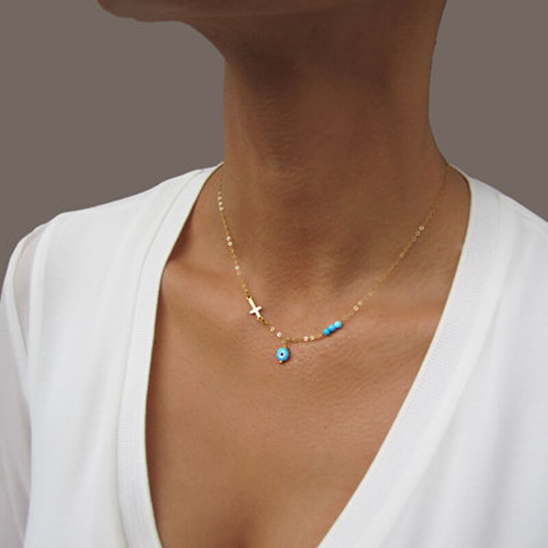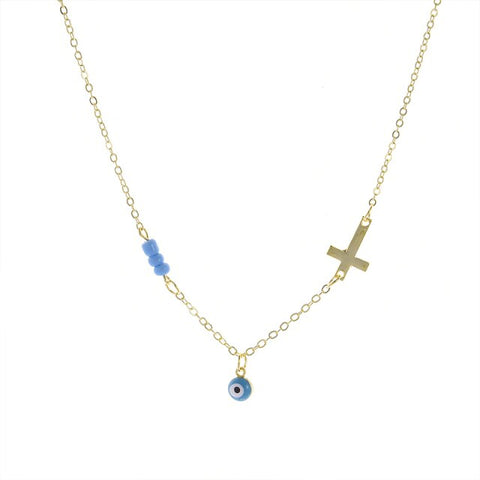 Este colar com cruz e olho é ideal para usar na missa, onde expressa a sua fé e devoção. É perfeito para mulheres que desejam adicionar um toque boémio e espiritual ao seu estilo. Está disponível em tonalidade prateada ou dourada, com um toque de azul, para que possa escolher a cor que mais combina consigo.