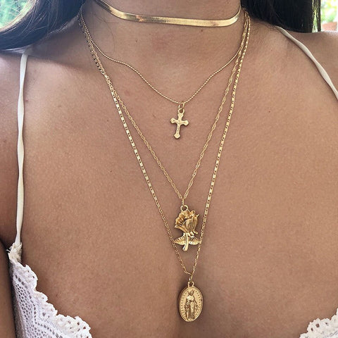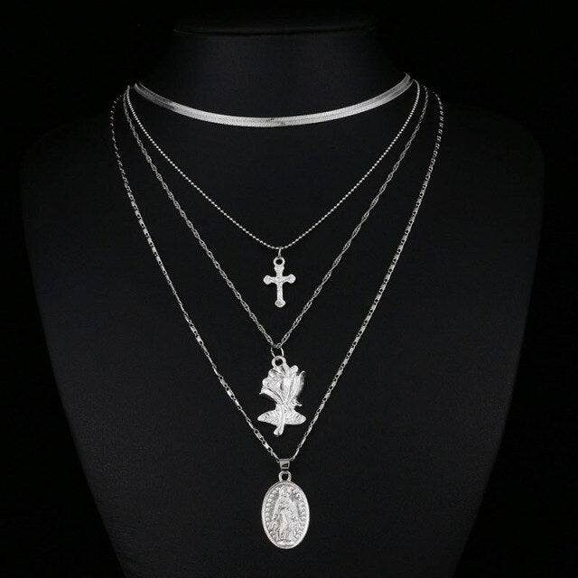 Uma bela flor embeleza este colar com cruz
