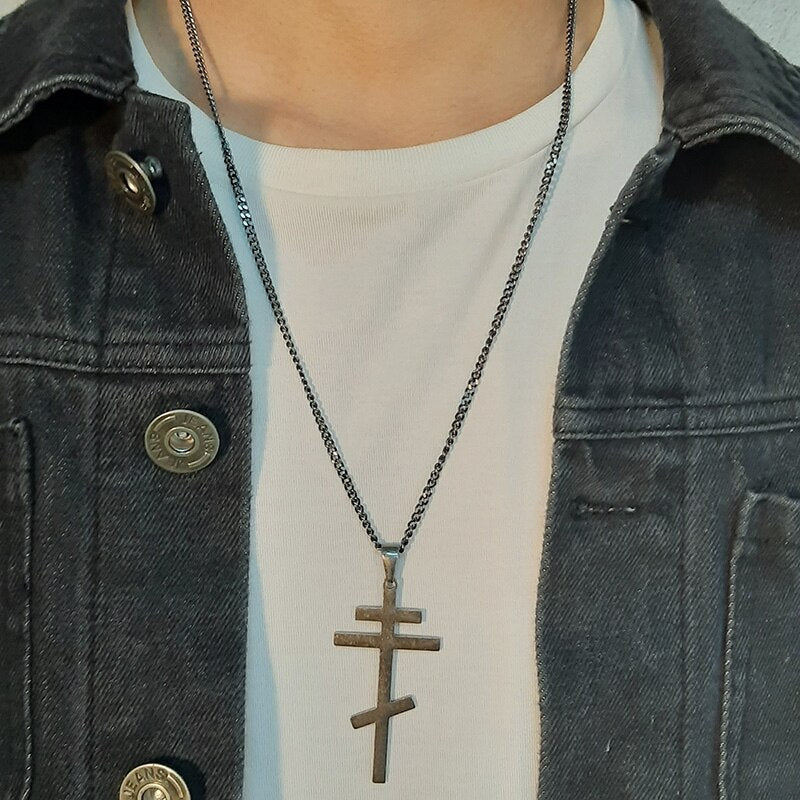 Este colar é adornado com um pendente de cruz ortodoxa.
