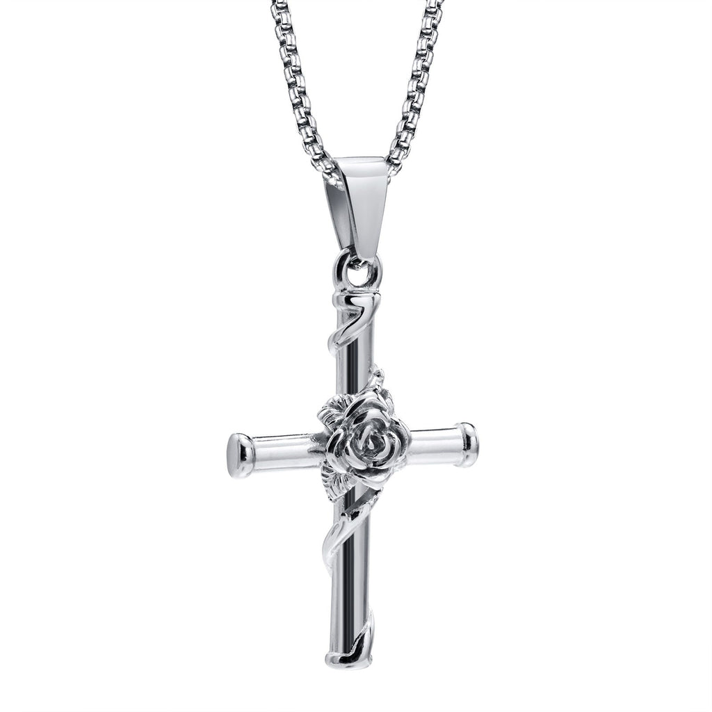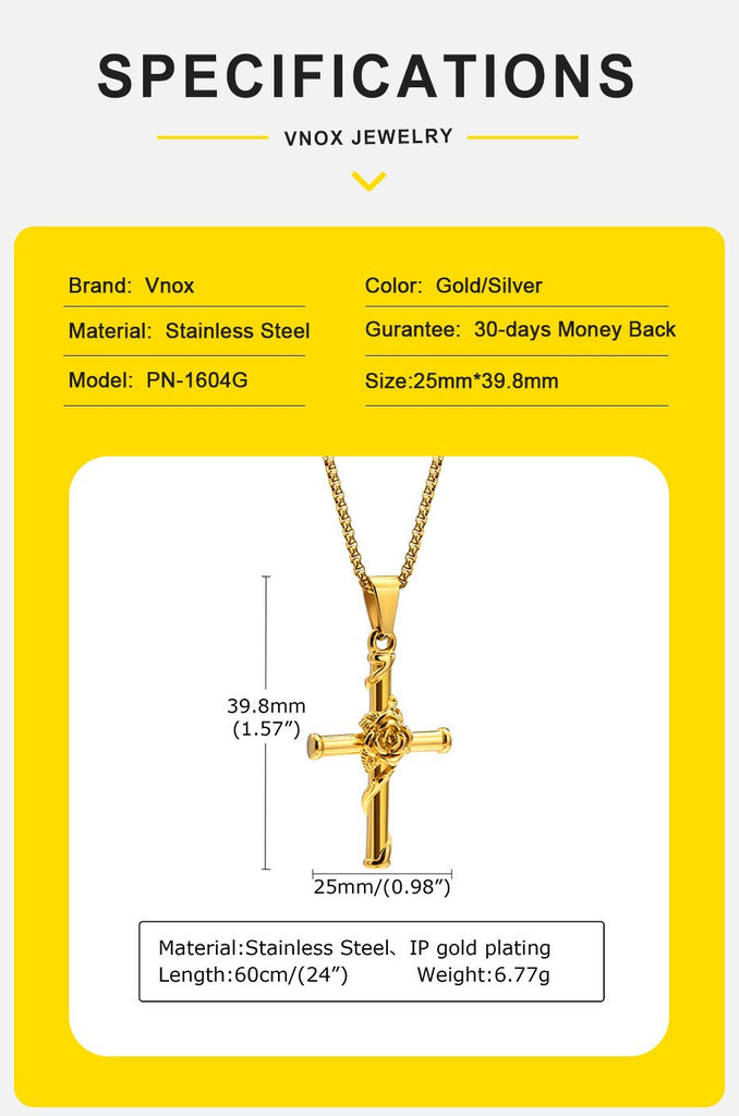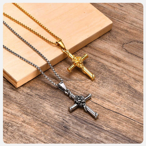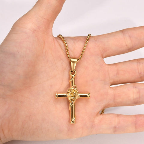 Esta impressionante cruz é embelezada por uma magnífica rosa, que lhe confere um toque de beleza e delicadeza. As rosas são consideradas uma das flores mais belas e simbolizam frequentemente o amor. A rosa deste colar expressa o teu imenso amor pelo Senhor nosso Deus e por tudo aquilo que Ele nos oferece a cada dia.