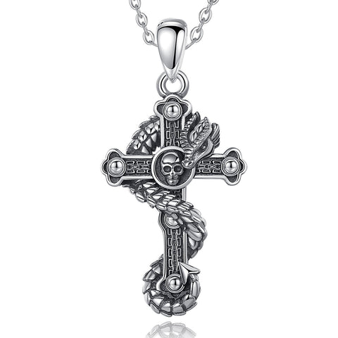 Mima-te com luxo com este colar cruz serpente gótico em prata.