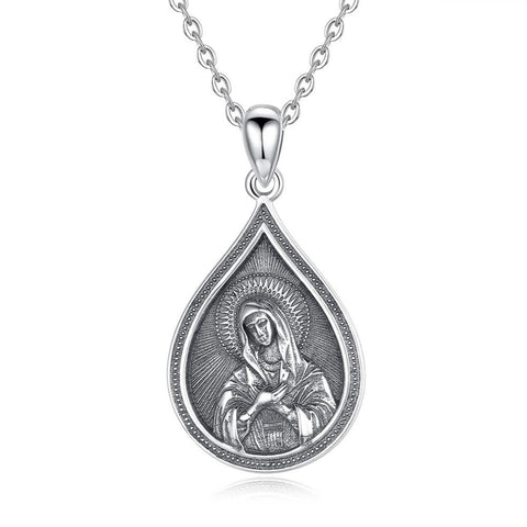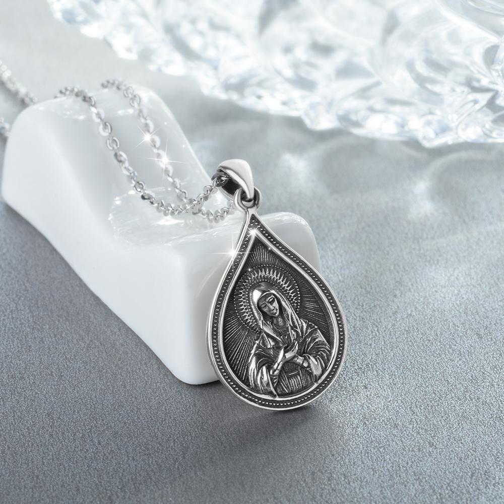 Esta linda joia é feita inteiramente de prata S925. Este material nobre é ideal para a criação de joias de alta qualidade. Apresenta uma bela gravação da Virgem Maria num pendente em forma de gota. Adequado tanto para homens como para mulheres.