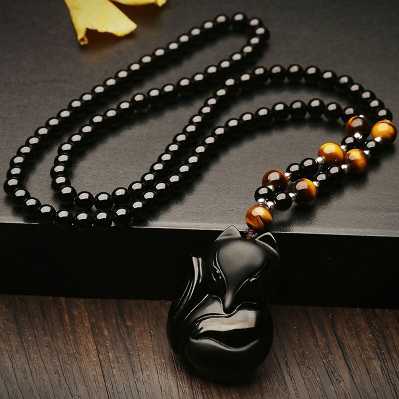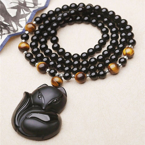 Colar raposa de Obsidiana para fãs de raposas. O colar é feito com contas naturais de obsidiana.
