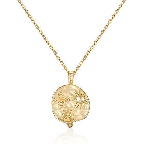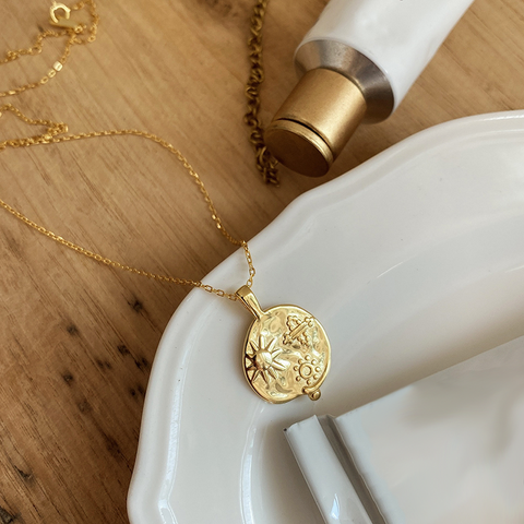 Esta joia capta o espírito vintage e adiciona um toque de luz ao teu estilo. A cor dourada confere um brilho quente ao teu decote, e o design evoca a beleza do universo.