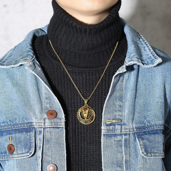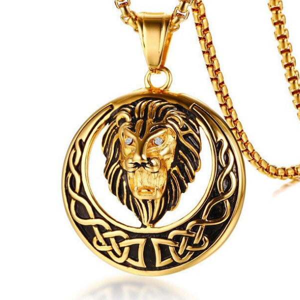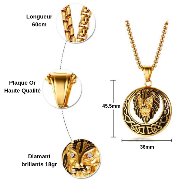 Magnífico colar de leão com padrão de serpente em aço dourado, com detalhes de serpente sobre fundo preto. A marca do leão nesta coleção alimenta a sua coragem e charme. Dois diamantes estão incrustados nos olhos do leão.