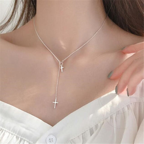 Este colar com cruz dupla é uma joia que não passa despercebida. O seu design único com duas cruzes entrelaçadas confere-lhe uma aparência estética impressionante. Fabricado em prata S925, este colar brilha com elegância e atrai todos os olhares.