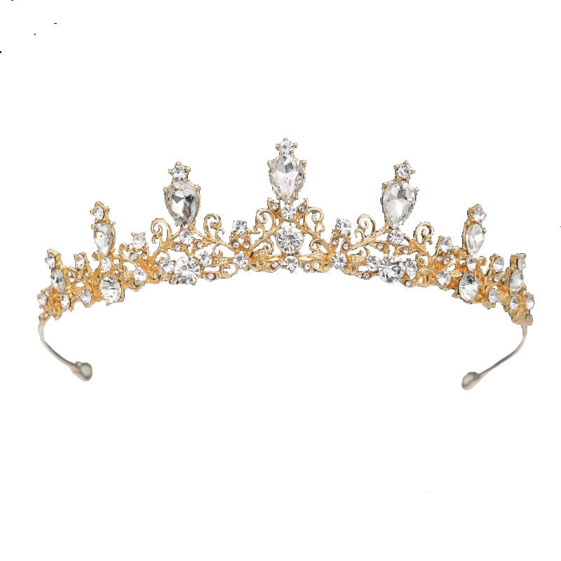 Uma coroa deslumbrante com design incrustado de pedras preciosas. Tiara dourada com cristais lapidados. Joia composta por várias camadas de strass. A estrutura é subtilmente elevada em certos pontos para conferir volume e sofisticação à peça. Uma tiara que fica maravilhosa sobre um penteado elegante.