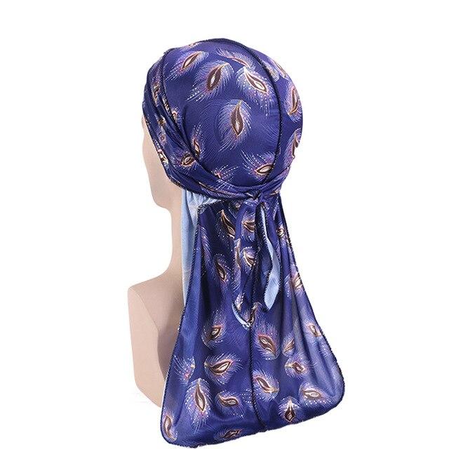 Durag azul-escuro com padrão floral. Um visual vintage que o fará destacar-se na multidão. Um acessório que pode ser usado de dia ou à noite para manter o cabelo no lugar.