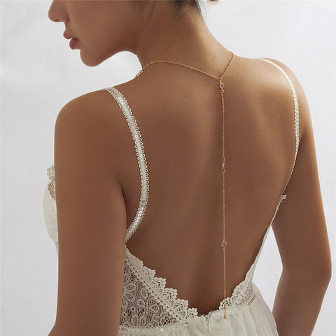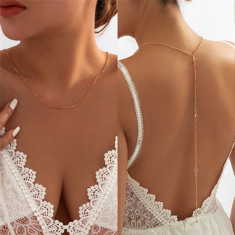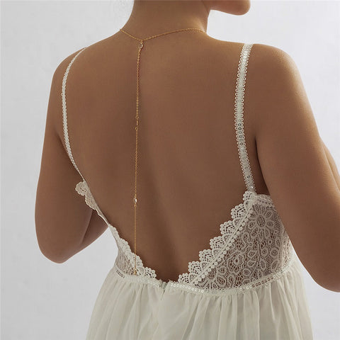 Este é um acessório delicado e feminino que complementa elegantemente as suas costas nuas. Este belíssimo colar de costas dourado, adornado com pequenas pérolas transparentes, realça as suas costas e revela toda a sua feminilidade. Com uma fina malha dourada, esta joia é simultaneamente delicada e original.