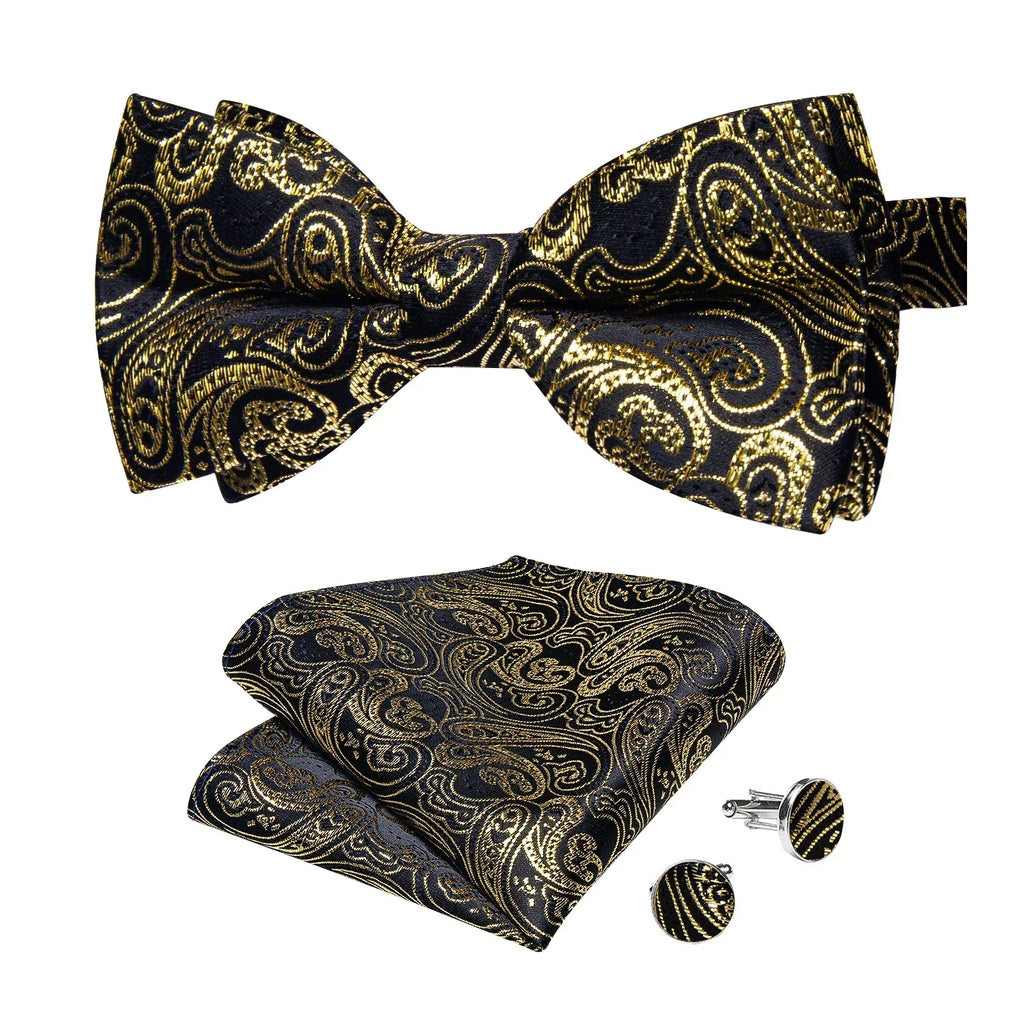 Esta gravata borboleta preta e dourada com padrão paisley é um acessório intemporal que certamente causará uma boa impressão. O padrão paisley confere um toque de personalidade e sofisticação à gravata, enquanto os tons de preto e dourado oferecem uma estética elegante e moderna. Foi concebida para ser tanto elegante como versátil, podendo ser usada em todas as ocasiões, desde casamentos e eventos formais até encontros mais descontraídos.