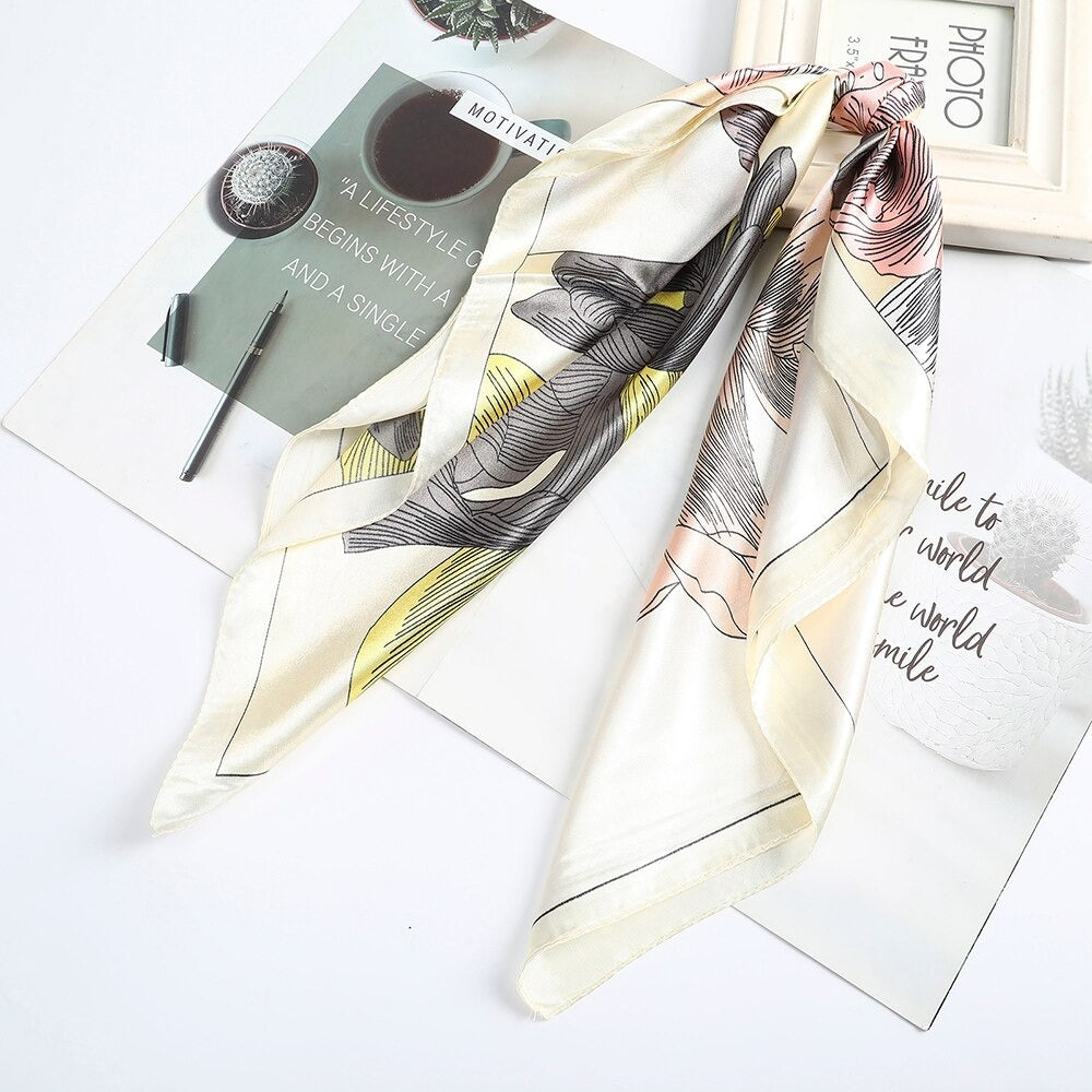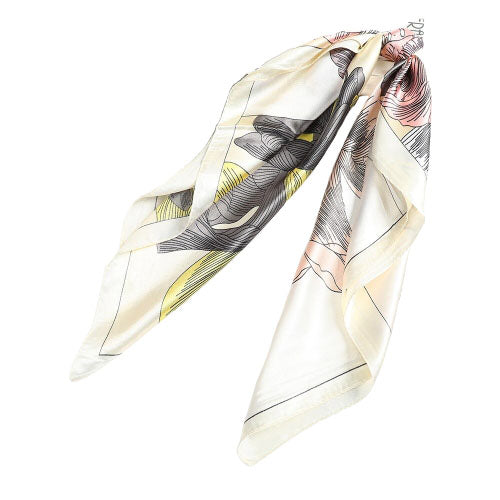Mime-se com um lindo lenço de cabelo inspirado em padrões poéticos e abstratos. Um estilo delicado e primaveril para este bonito lenço em tons de branco, rosa-claro e cinzento.