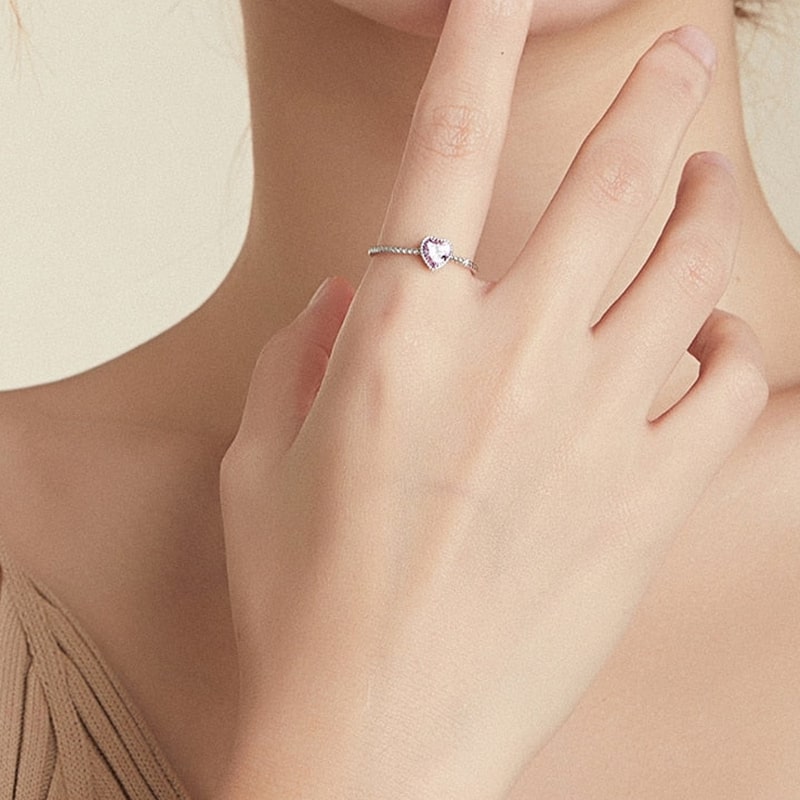 Anel deslumbrante com coração cor-de-rosa.