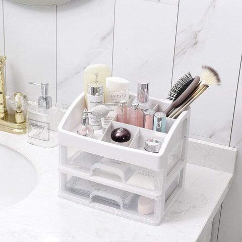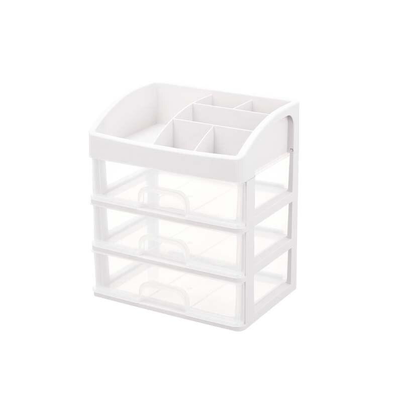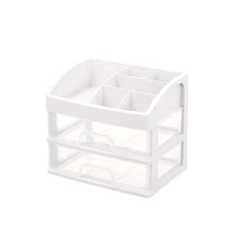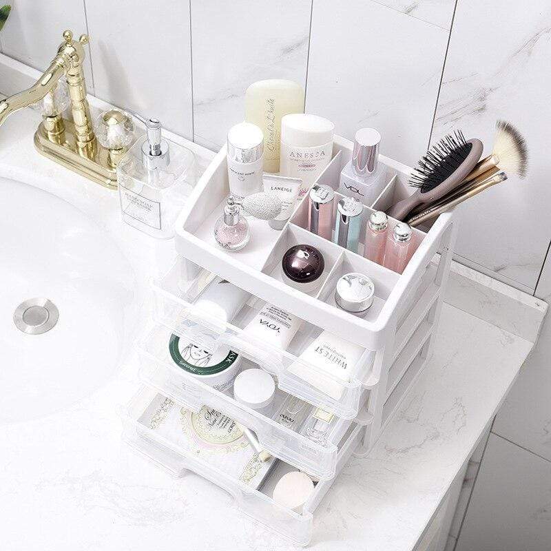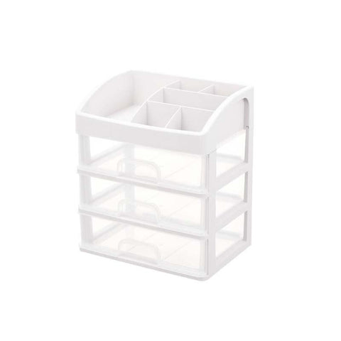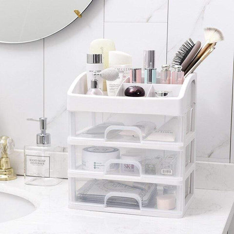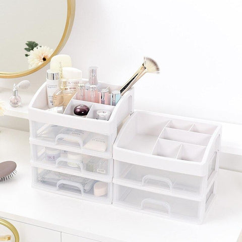 Grande organizador de maquilhagem transparente com gavetas para arrumar maquilhagem e produtos de beleza. Disponível com 2 ou 3 gavetas, com 6 compartimentos no topo para outros cosméticos ou acessórios de maquilhagem.