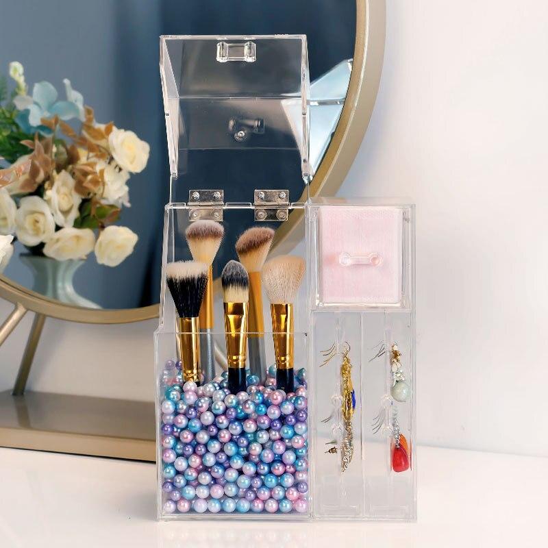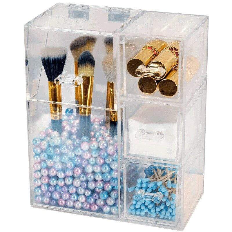 Este suporte de maquilhagem multifuncional permite-lhe armazenar facilmente pincéis de maquilhagem, batons e todos os seus produtos de cosmética. Para isso, são necessárias pequenas bolas brancas que mantêm os pincéis na horizontal sem que se toquem. A caixa também possui gavetas para guardar outros produtos, acessórios ou até mesmo joias.