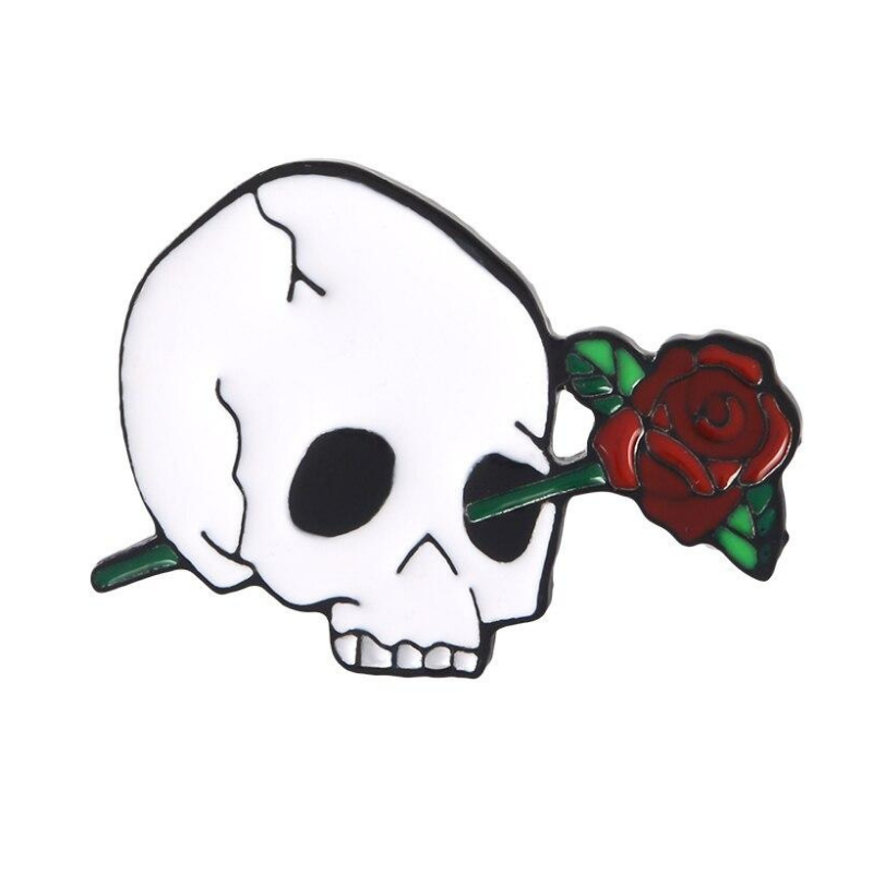 Aqui está um pin romântico em forma de caveira! Um pequeno crânio emotivo, atravessado por uma rosa vermelha no olho, exala um charme especial.