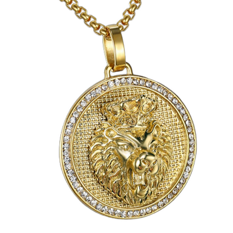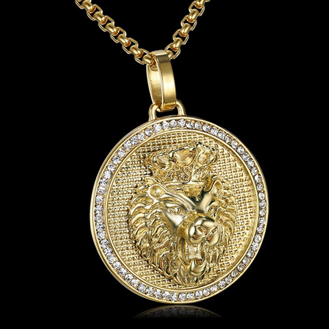 Impactante Colar Pingente de Leão Dourado Rugindo transmite superioridade! Adoramos o brilho desta joia. Diamante, cabeça de leão, coroa – tudo está presente para um estilo dantesco.
