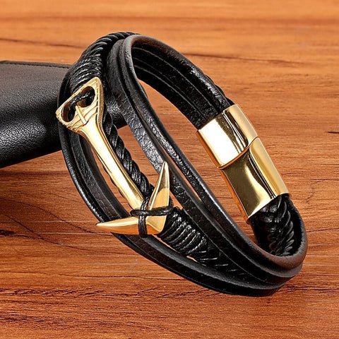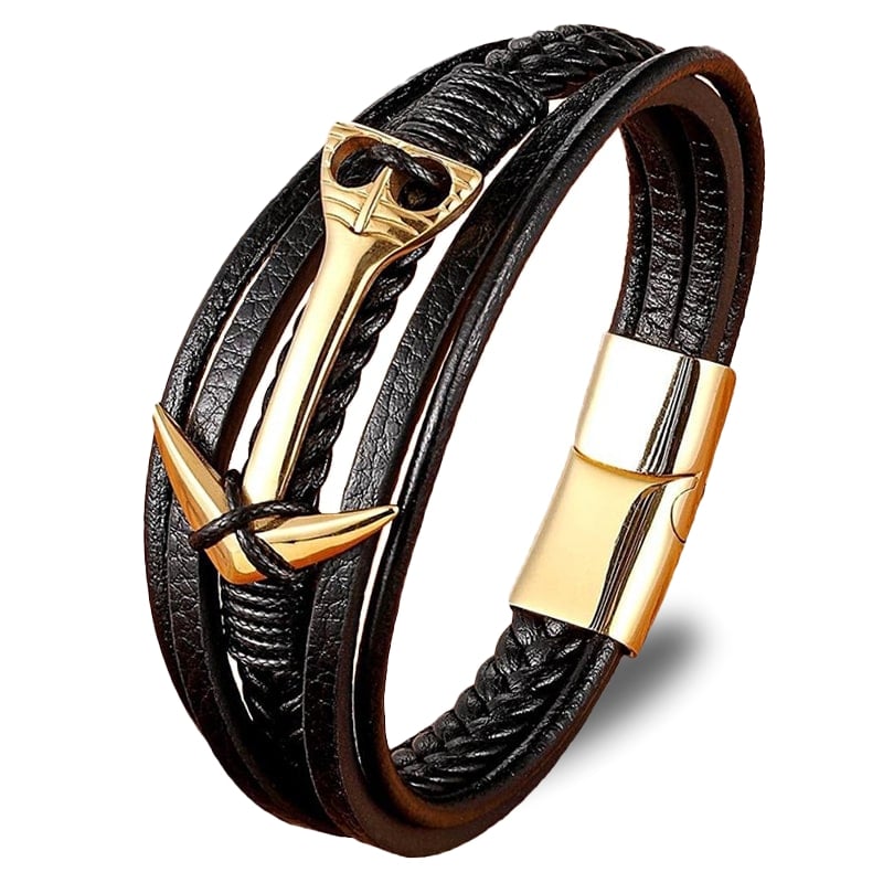 Exprima a sua paixão pelo mundo marítimo e realize o sonho do marinheiro moderno com esta pulseira masculina de couro adornada com uma âncora náutica. Ideal para residentes da costa ou para homens com alma de capitão, este acessório de moda tem tudo para atrair aqueles que desejam destacar o seu estilo com um toque único de elegância. Fabricada em couro de alta qualidade e com uma âncora e fecho em aço inoxidável dourado, esta pulseira com âncora náutica é fácil de usar no pulso e acompanha o seu dono em todas as suas viagens marítimas — podendo até ser usada como amuleto da sorte.