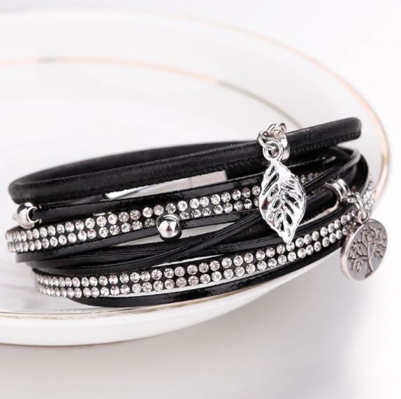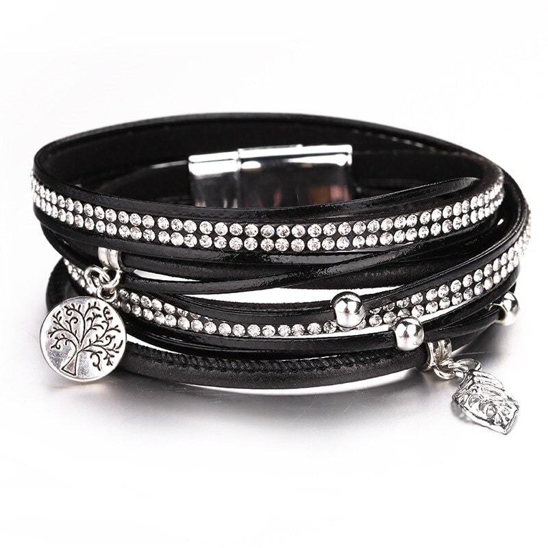 Se deseja adicionar um toque de charme ao seu guarda-roupa, experimente esta elegante pulseira preta em couro com o símbolo da árvore da vida para mulher. Esta pulseira versátil com o símbolo da árvore da vida combina com qualquer estilo de vestuário, do clássico ao sofisticado. Apresenta encantos de árvore da vida e folhagens que simbolizam força, elegância e serenidade. Esta pulseira com árvore da vida possui um fecho magnético que a mantém segura no pulso.
