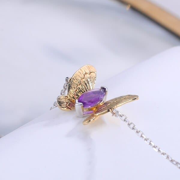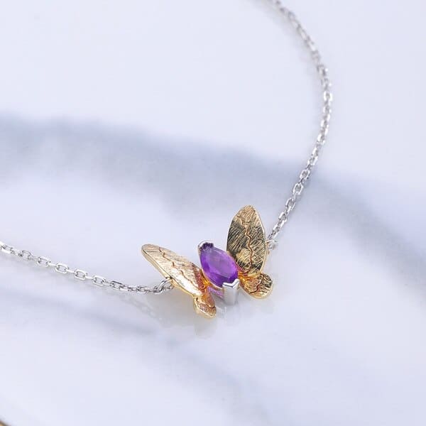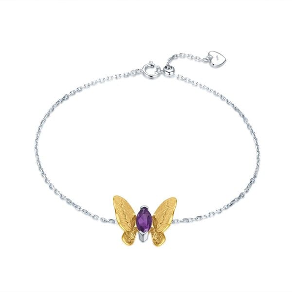 Transforme e realce o seu visual com esta encantadora pulseira de prata adornada com uma borboleta dourada e um cristal de ametista. A borboleta simboliza transformação e mudança, enquanto a ametista representa elegância e luxo.