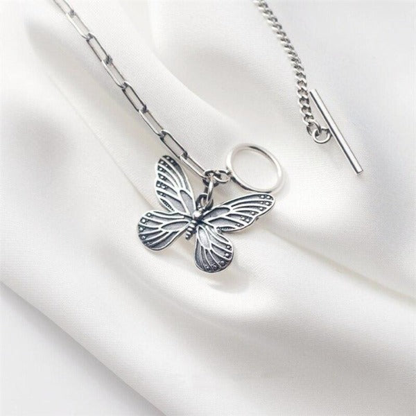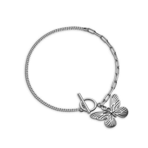 Esta pulseira boémia prateada possui duas correntes distintas e um fecho invulgar, complementada por um pendente em forma de borboleta. As asas apresentam motivos finamente gravados e um formato que lembra a emblemática e simbólica borboleta-monarca.
