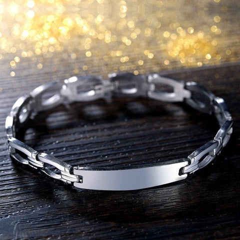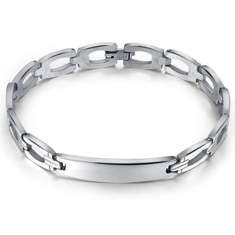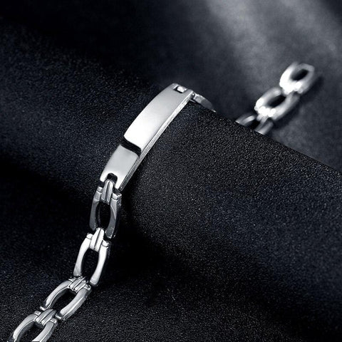 Aço inoxidável de alta qualidade para uma pulseira de corrente elegante. Esta pulseira de corrente é fabricada com precisão e apresenta uma placa prateada semelhante à da corrente lateral. Cada elo de aço é polido com bordas suaves e refinadas.