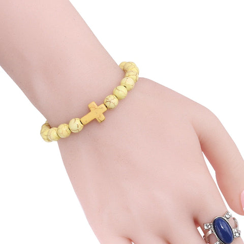 Pulseira com cruz, feita com elástico flexível (ajusta-se a todos os pulsos) e contas de pedra natural. Disponível em várias cores, esta pulseira cristã combina com elegância e estilo com qualquer look. Use no seu pulso todo o amor e proteção de Cristo com estilo.