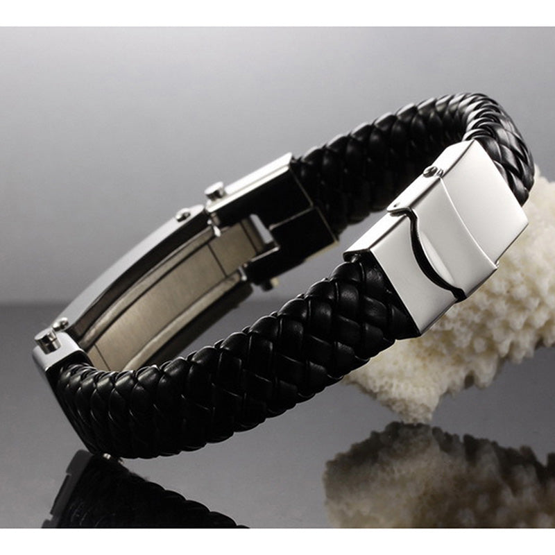 Surpreenda-se com esta pulseira cristã masculina feita de couro e aço inoxidável.