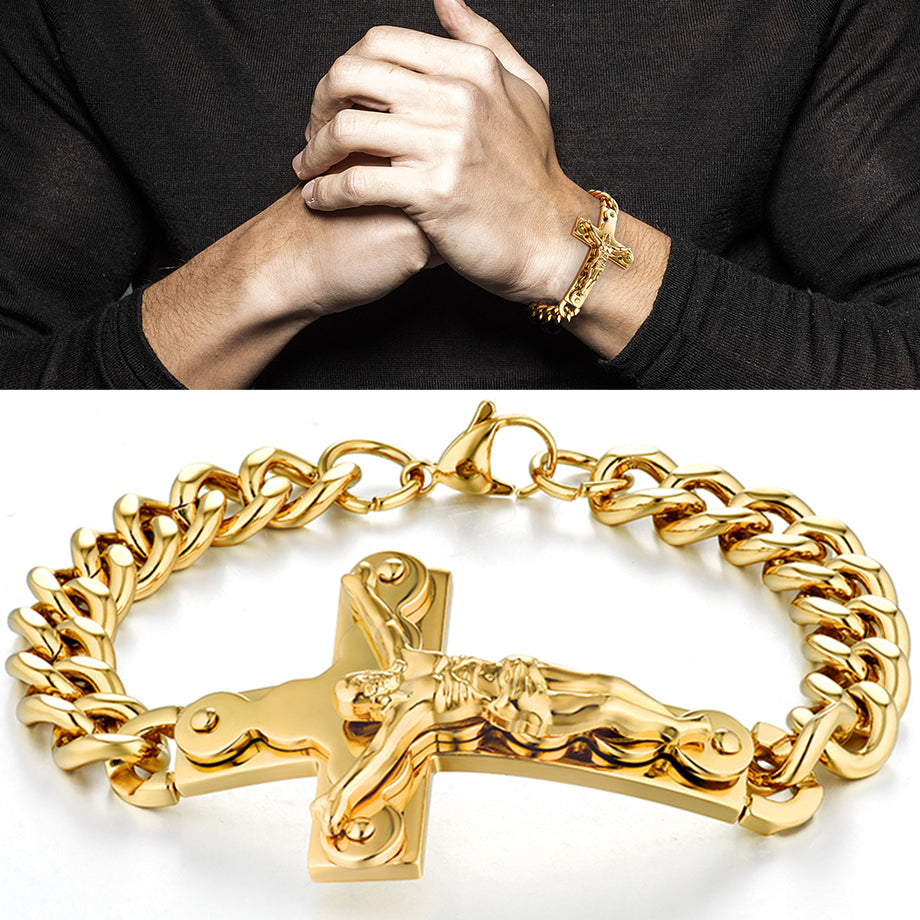 Pulseira religiosa de alta qualidade a um preço acessível. Esta magnífica pulseira religiosa dourada em aço inoxidável é única.